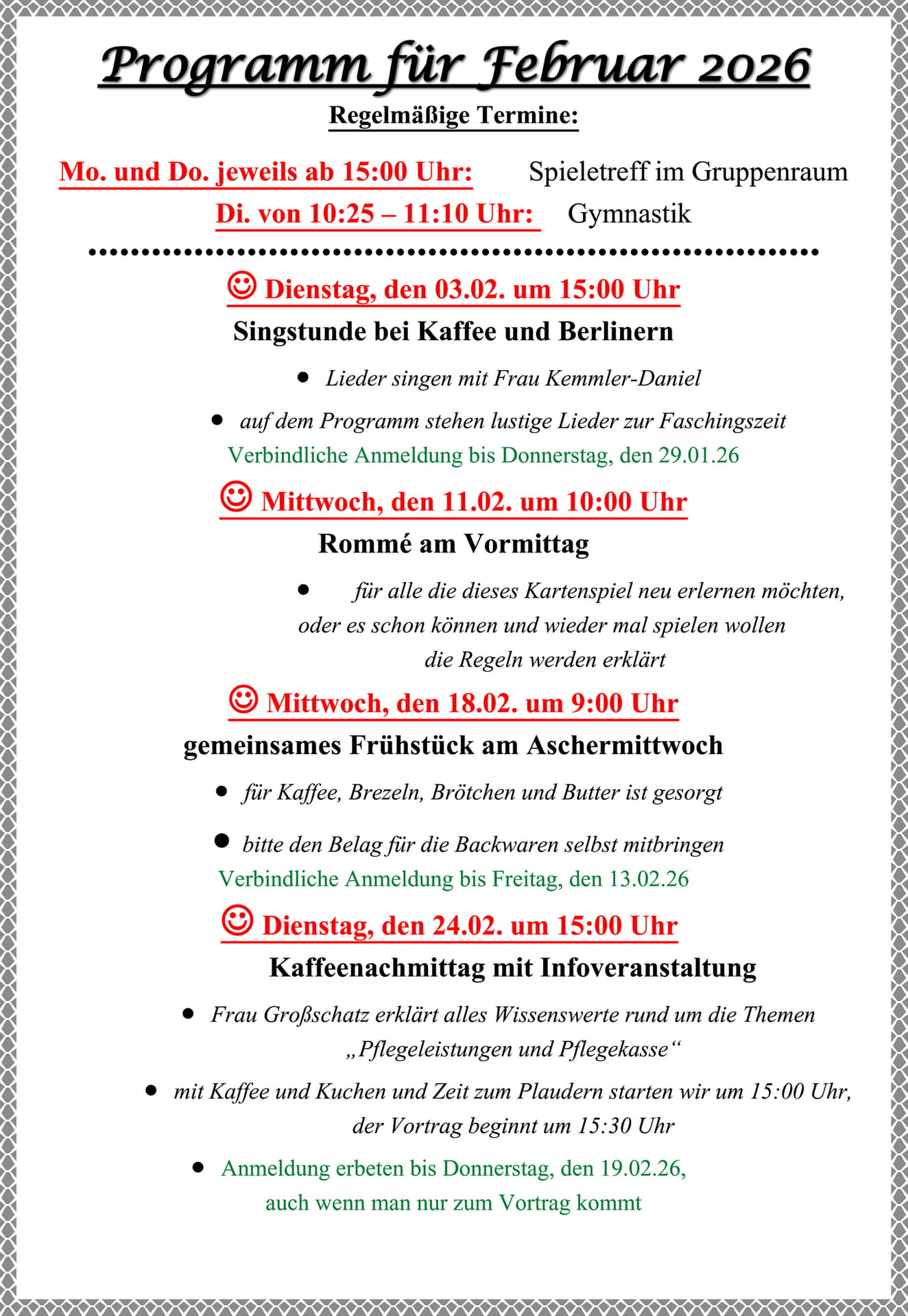 - Mo. und Do. jeweils ab 15:00 Uhr: Spieletreff im Gruppenraum