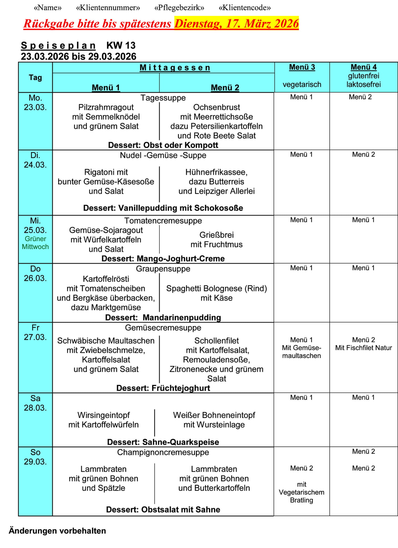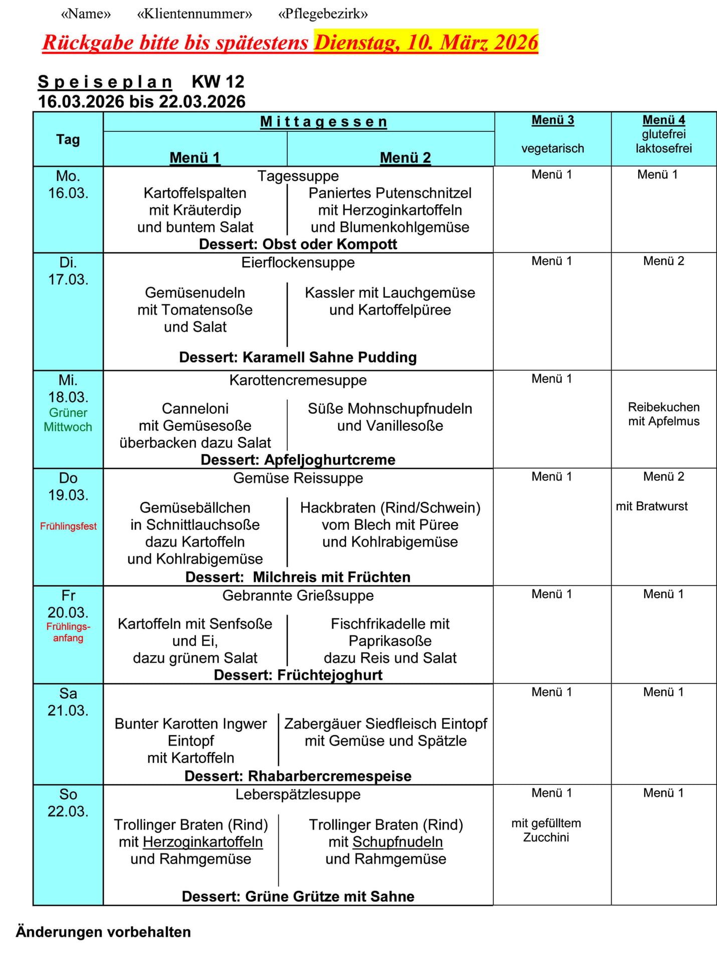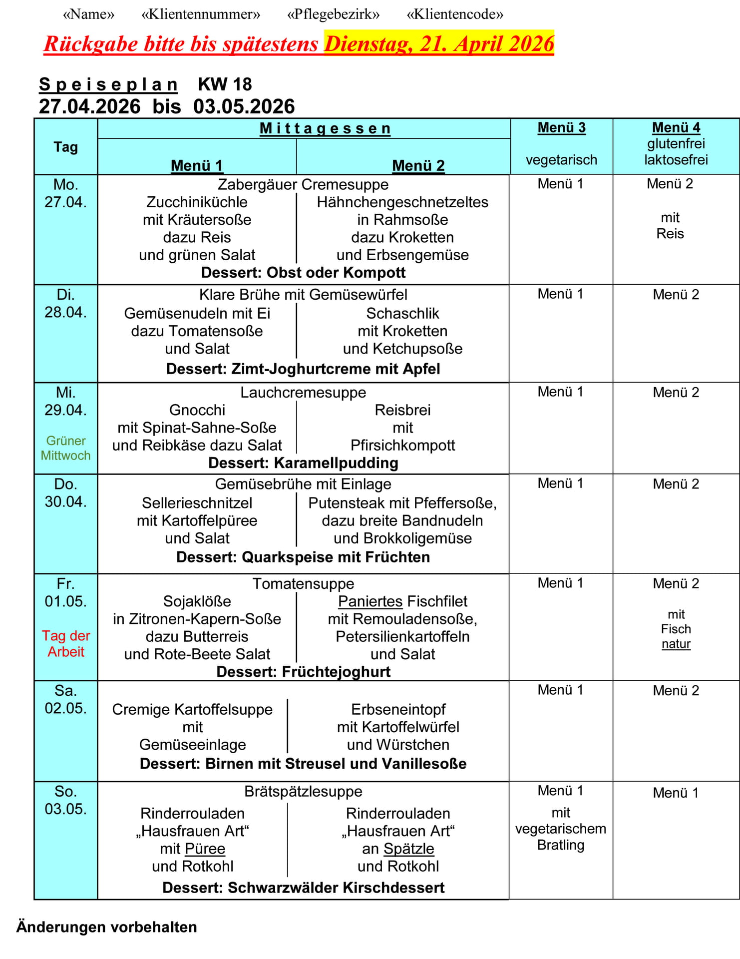 Sie erhalten den Speiseplan für die übernächste Woche immer mittwochs oder donnerstags. Darauf kreuzen Sie Ihre Essenswünsche an. Das Exemplar mit dem Vermerk „Rückgabe“ geben Sie bitte dem Essensfahrer bis spätestens dienstags wieder mit.